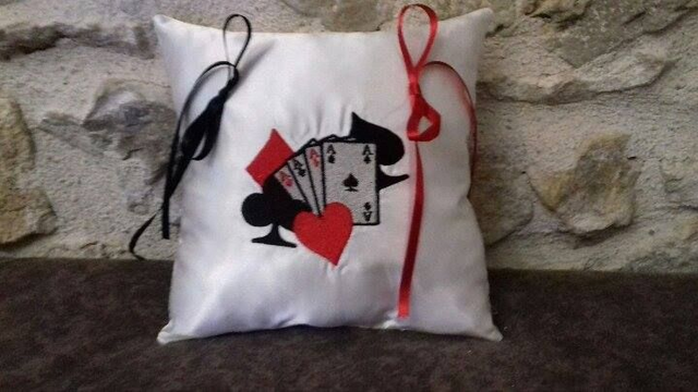 Coussin porte alliances motif Carré D'As de forme carré avec deux liens pour les alliances.